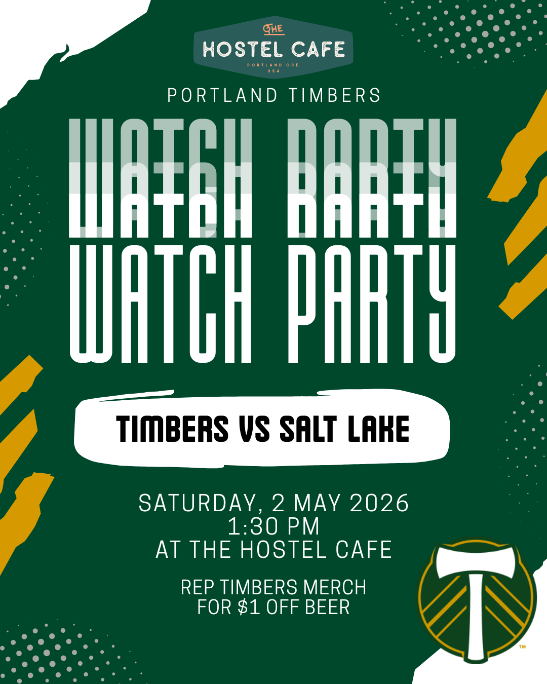Join us at The Hostel Cafe to watch the Portland Timbers vs. Real Salt Lake match live. Grab a meal, enjoy a cold beer, and cheer on your favorite soccer team with fellow fans. The match will be shown in our commons and, weather permitting, in the courtyard, so you won’t miss a minute of the action.