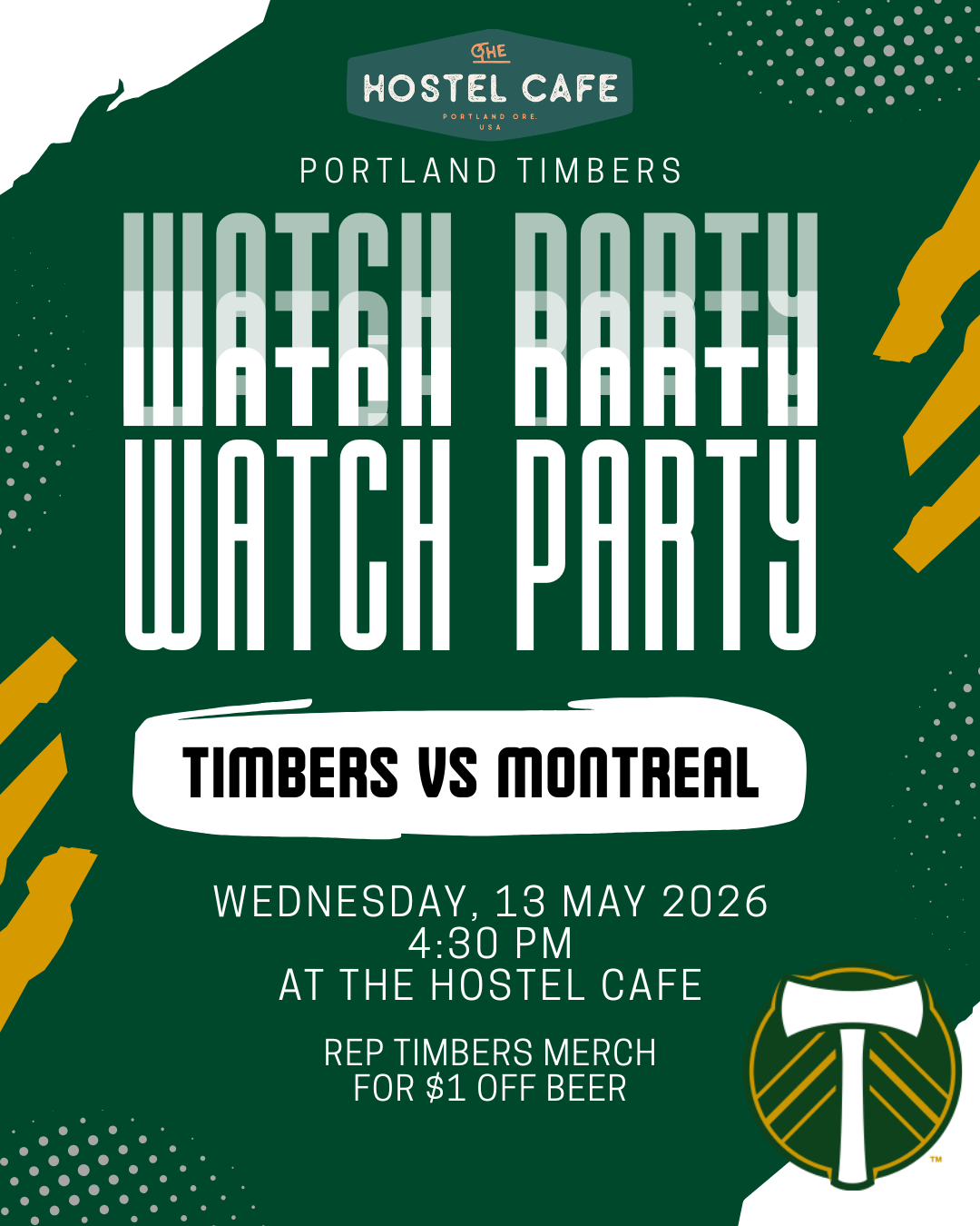 Join us at The Hostel Cafe to watch the Portland Timbers vs. Montréal match live. Grab a meal, enjoy a cold beer, and cheer on your favorite soccer team with fellow fans. The match will be shown in our commons and, weather permitting, in the courtyard, so you won’t miss a minute of the action.