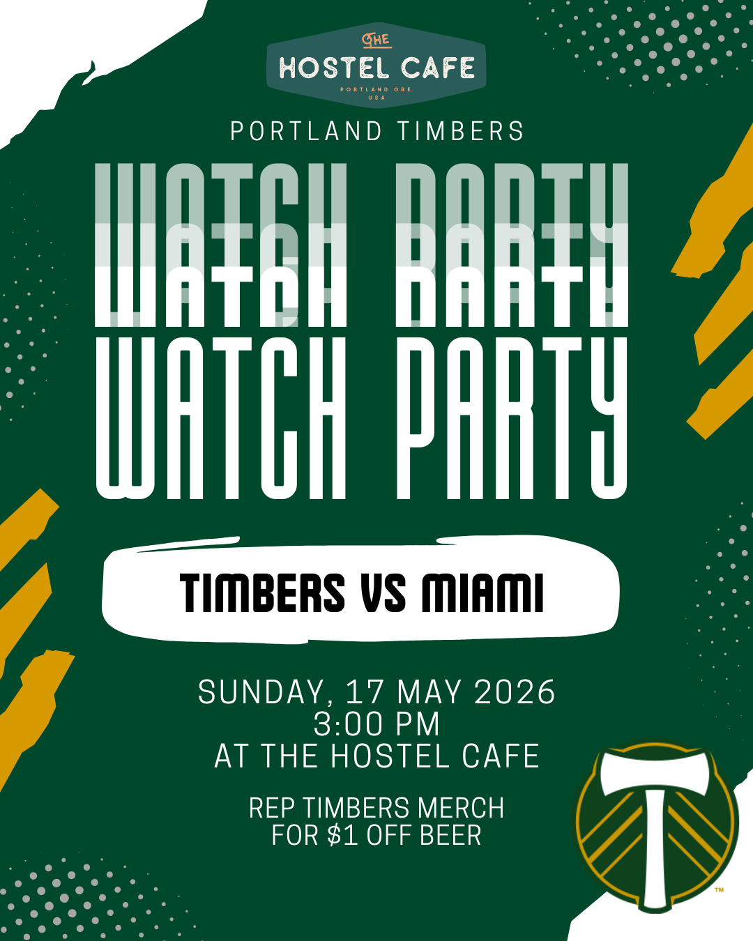 Join us at The Hostel Cafe to watch the Portland Timbers vs. Inter Miami match live. Grab a meal, enjoy a cold beer, and cheer on your favorite soccer team with fellow fans. The match will be shown in our commons and, weather permitting, in the courtyard, so you won’t miss a minute of the action.
