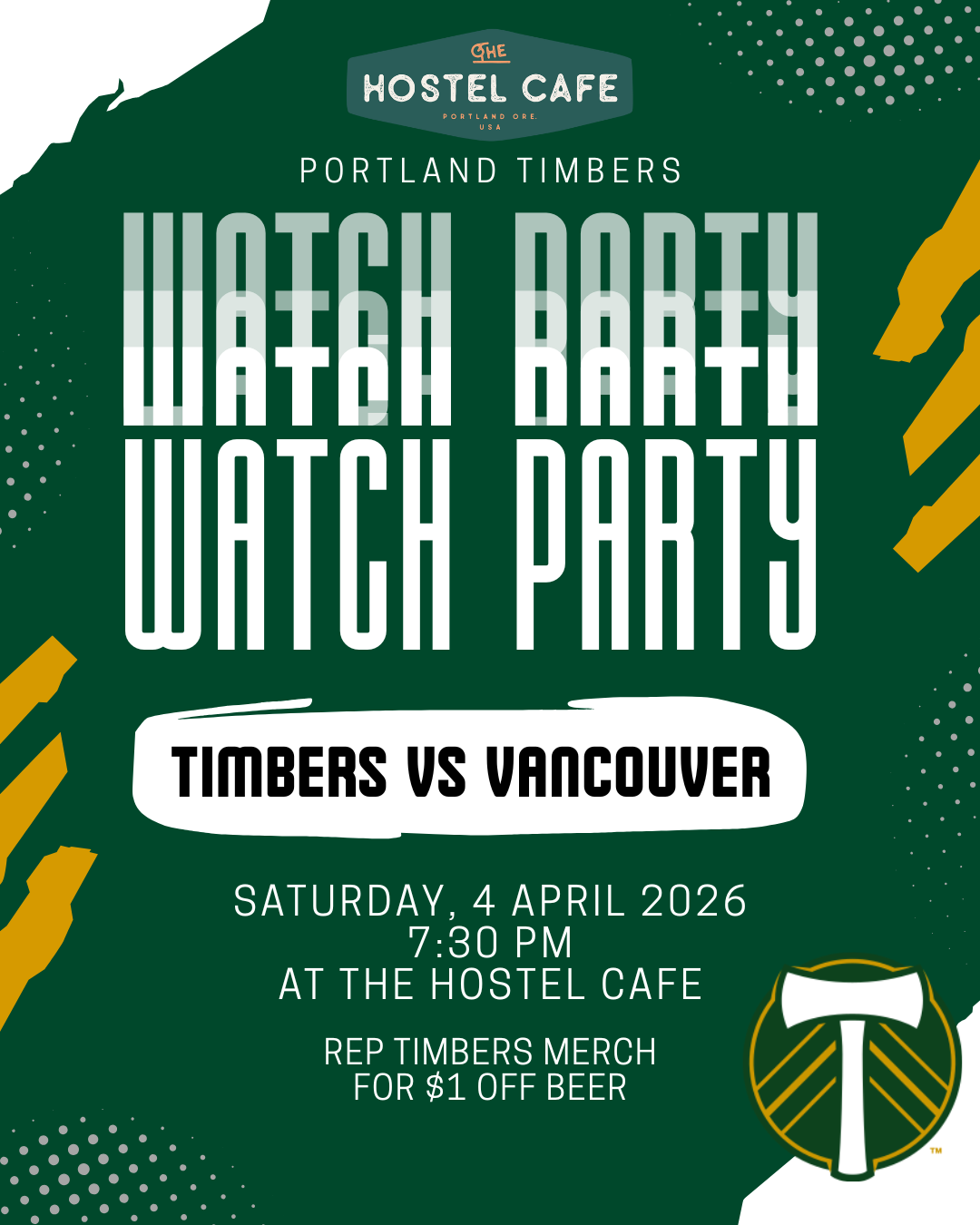 Join us at The Hostel Cafe to watch the Portland Timbers vs. Vancouver match live. Grab a meal, enjoy a cold beer, and cheer on your favorite soccer team with fellow fans. The match will be shown in our commons and, weather permitting, in the courtyard, so you won’t miss a minute of the action.